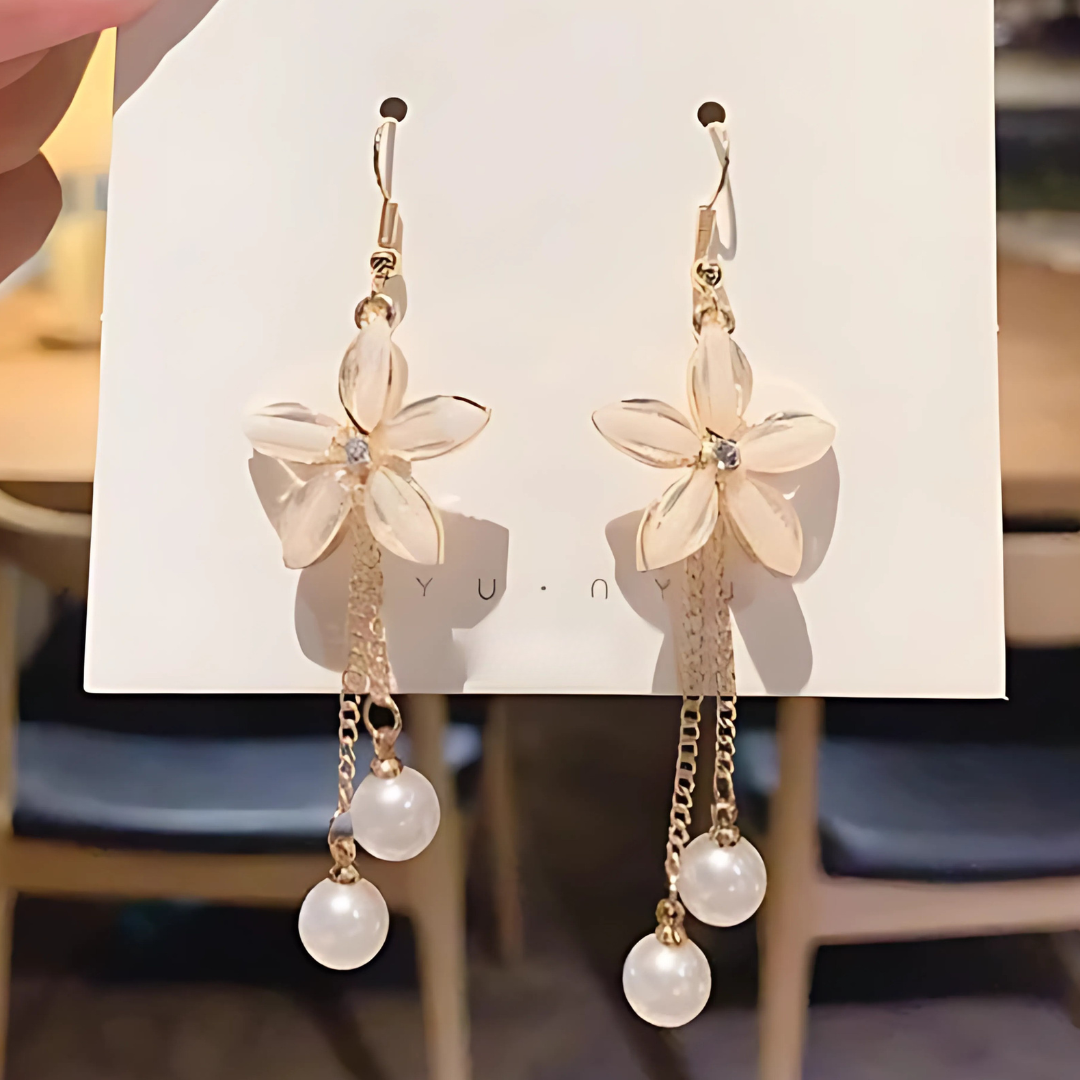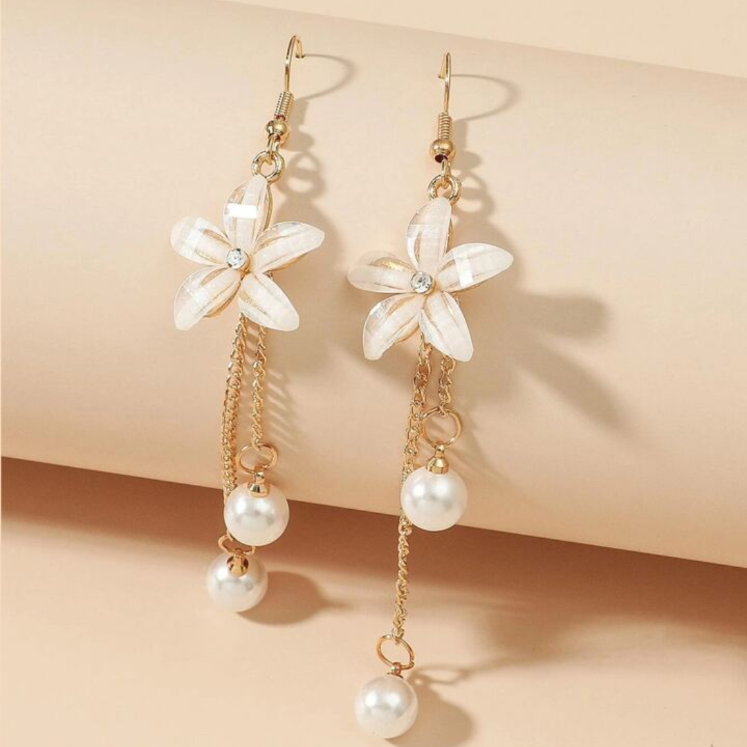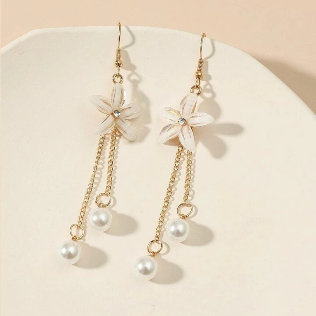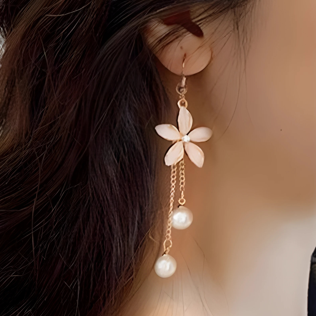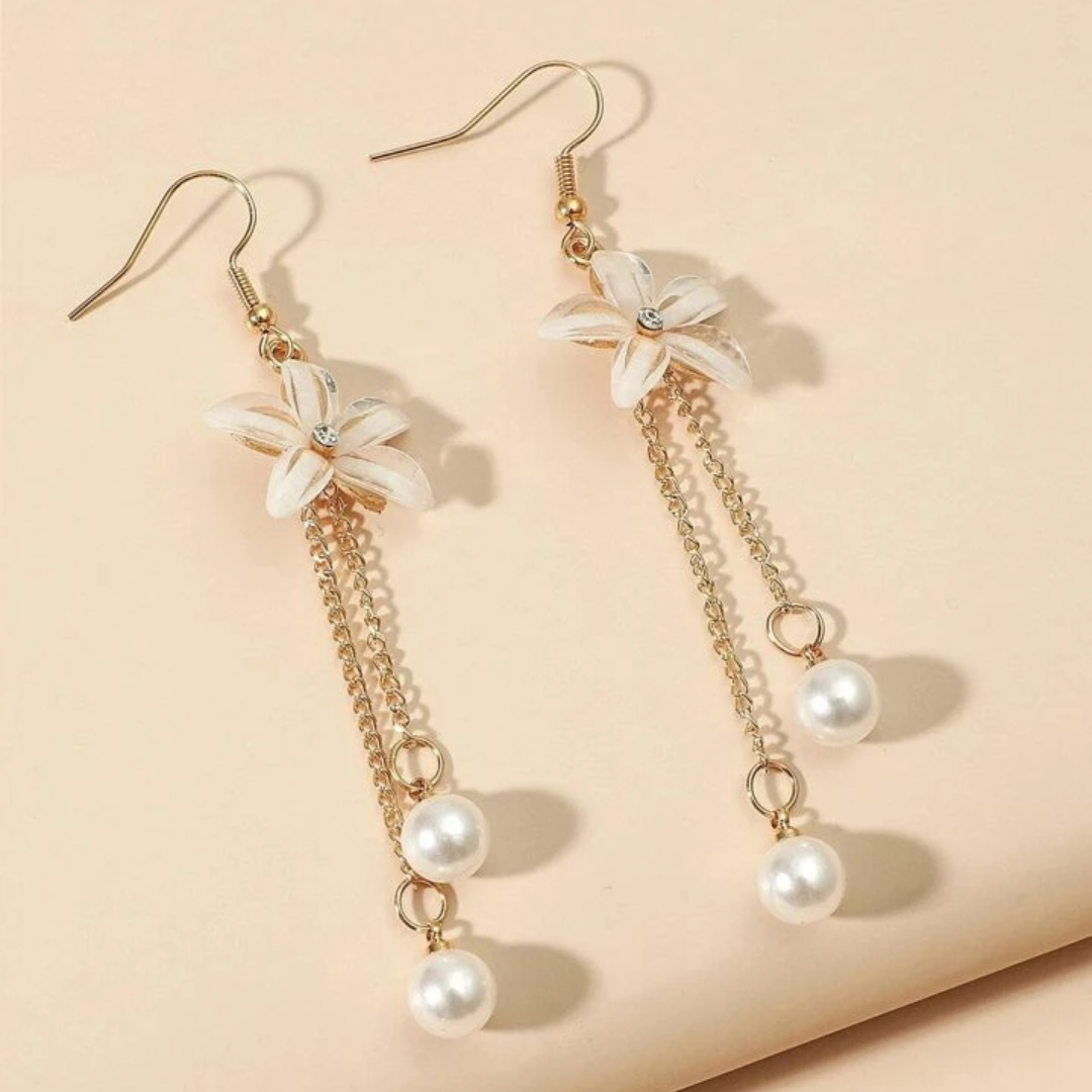 Deze elegante druppeloorbellen hebben een delicaat bloemmotief dat wordt geaccentueerd door parelhangers, waardoor ze een sierlijke en vrouwelijke stijl creëren. Door hun lichtgewicht structuur en tijdloze charme zijn ze een ideale keuze voor zowel dagelijks gebruik als speciale gelegenheden.