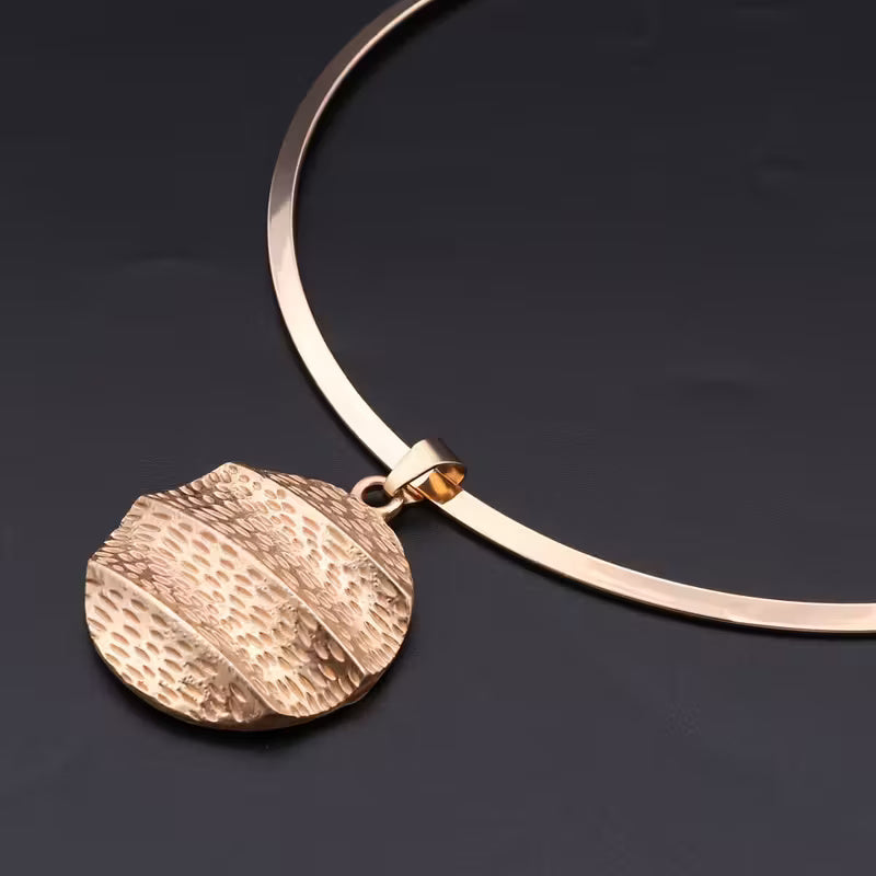 Statement Halsketting: De halsketting heeft een strakke, open choker-stijl met een centraal rond hanger-element. Dit element is voorzien van een prachtige gehamerde textuur, onderverdeeld in horizontale banen, wat zorgt voor een dynamisch en artistiek effect. De hanger beweegt sierlijk mee en vangt het licht op een subtiele wijze.