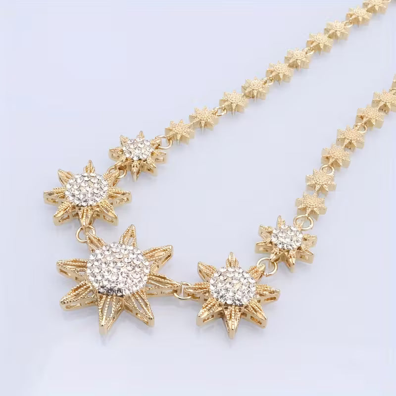 Betoverende Halsketting: Een vergulde ketting die versierd is met een reeks stralende stermotieven. Elk sterretje is rijkelijk ingelegd met fonkelende kristallen, waarbij het centrale element een extra grote, oogverblindende ster is die gegarandeerd de aandacht trekt. Een ware blikvanger die uw decolleté laat schitteren.