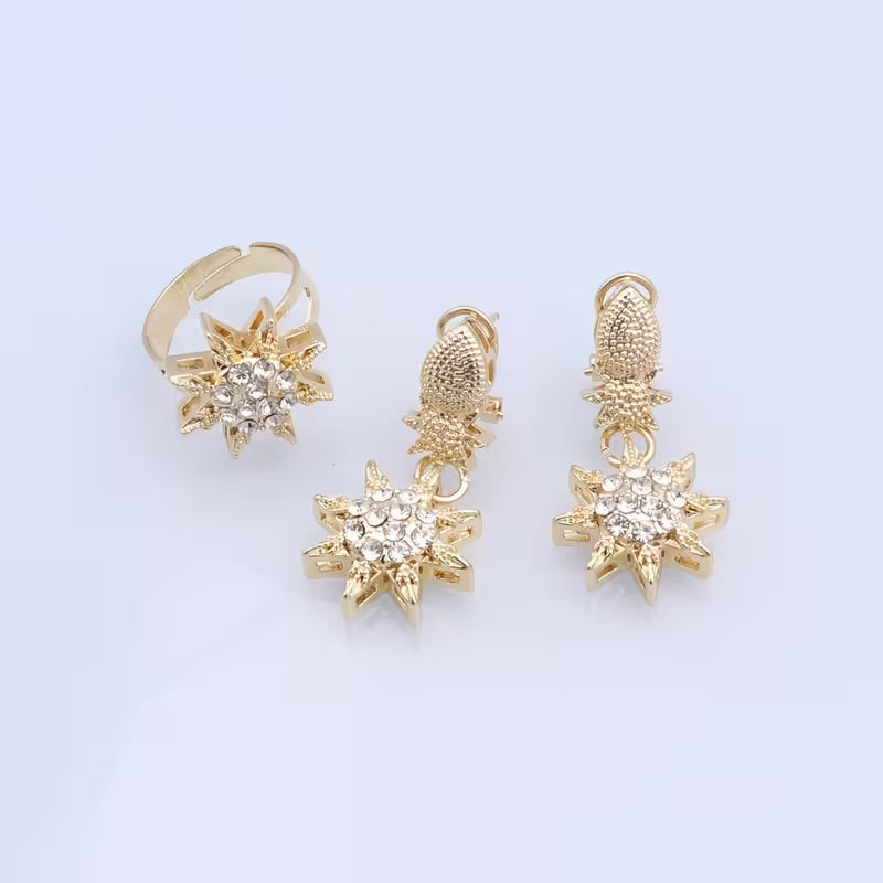Verfijnde Ring: De verstelbare ring maakt de set compleet, met een prachtig stermotief dat eveneens is voorzien van sprankelende kristallen. Het perfecte detail om uw handen te laten schitteren.